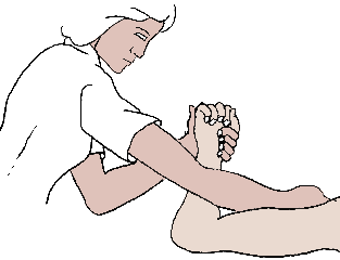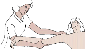 Złap rękę poniżej nadgarstka. Drugą ręką złap w ten sposób, żeby palce pacjenta znajdowały się na zewnętrznej stronie Twojej dłoni. Trzymając dłoń pacjenta w ten sposób zginaj jego nadgarstek do przodu i następnie do tyłu o około 90 stopni. Palce wyprostują się samoczynnie.